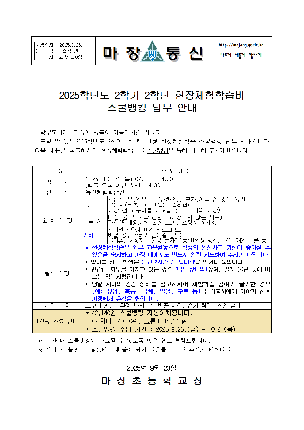 2025학년도 2학기 2학년 현장체험학습비 스쿨뱅킹 납부 안내