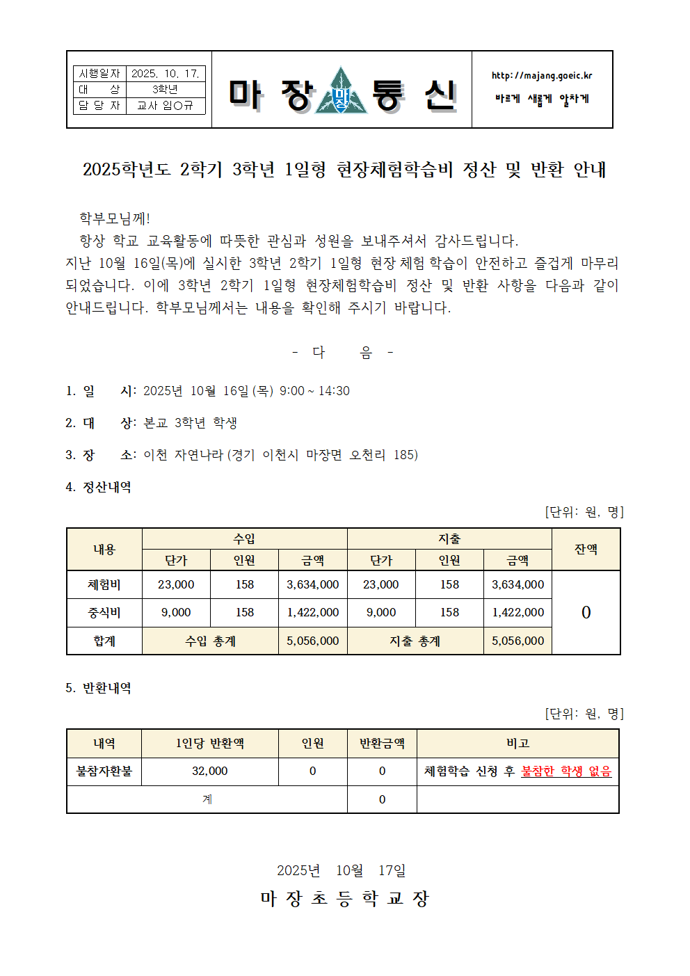 2025학년도 2학기 3학년 현장체험학습비 정산 안내장