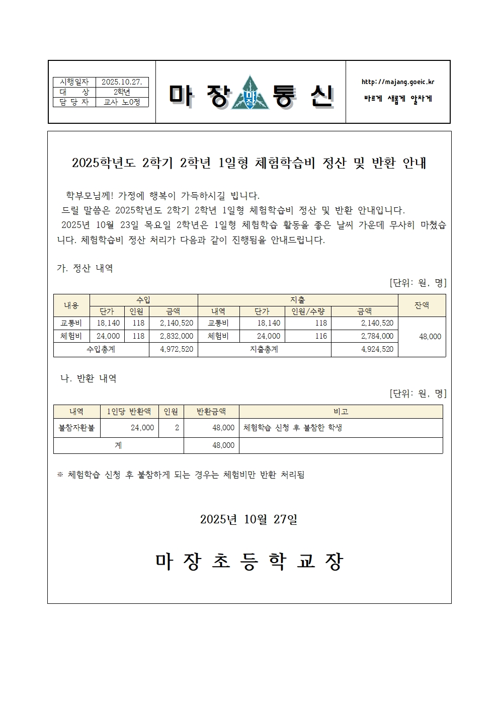 2025학년도 2학기 2학년 1일형 체험학습비 정산 및 반환 안내